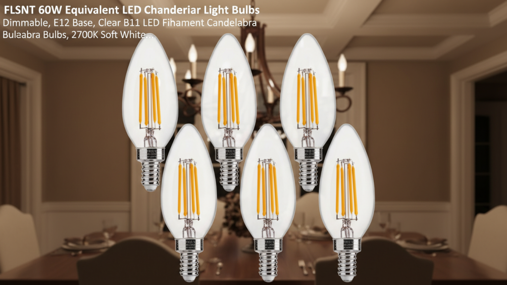 4) FLSNT 60W Equivalent LED Chandelier Light Bulbs, Dimmable, E12 Base, Clear B11 LED Filament Candelabra Bulbs, 2700K Soft Whit…